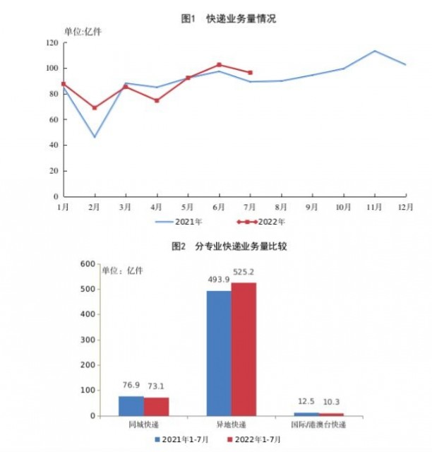 8月12日消息,据国家邮政局发布的数据显示,1-7月,全国快递服务企业业务量累计完成608。6亿件,同比增长4。3%;业务收入累计完成5880。4亿元,同比增长3。7%。其中,同城业务量累计完成73。1亿件,同比下降4。9%;异地业务量累计完成525。2亿件,同比增长6。3%;国际/港澳台业务量累计完成10。3亿件,同比下降17。8%。7月份,全国快递服务企业业务量完成96。5亿件,同比增长8。0%;业务收入完成898。2亿元,同比增长8。6%。