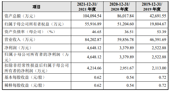 据招股说明书数据显示,2019年至2021年,贝迪新材分别实现营业总收入4.63亿元、5.98亿元与8.42亿元;分别实现归母净利润0.25亿元、0.33亿元与0.46亿元。2022年上半年,贝迪新材实现营业总收入4.25亿元,较去年同期增长8.81%;实现归母净利润0.22亿元,较去年同期下降0.49%,营收与净利逐年稳步提升!