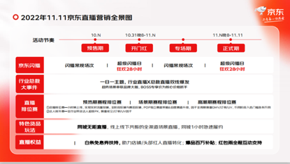 今年京东11。11,京东直播将通过“京东闪播”、“总裁价到”、“行业直播日”、“11。11超级排位赛”、“城市LIVE生活节”五大玩法,轮番上阵,让更多商家增加量、提升直播转化率。