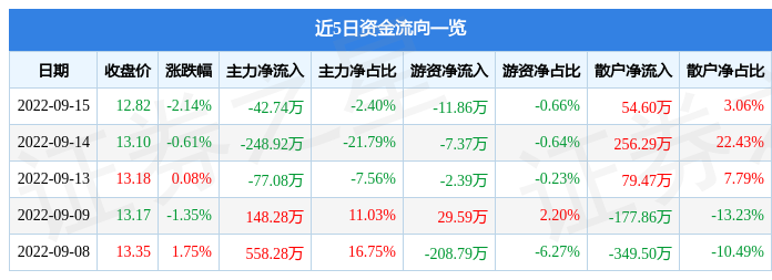 资金流向数据方面,9月15日主力资金净流出42。74万元,游资资金净流出11。86万元,散户资金净流入54。6万元。