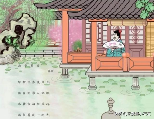 译文:绿树葱郁浓阴夏日漫长,楼台的倒影映入了池塘。水精帘在抖动微风拂起,满架蔷薇惹得一院芳香。
