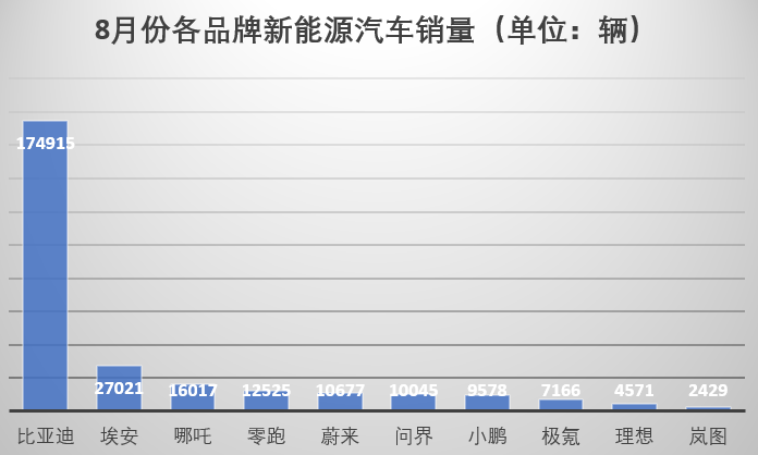 埃安今年的市场表现不错,8月销量2.7万辆,较去年增长133%,排在新能源汽车销量榜第二,它前面是一骑绝尘的比亚迪。