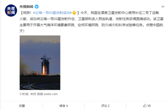 9 月 21 日消息,据央视报道,刚刚,我国在酒泉发射中心使用长征二号丁运载火箭,成功将云海一号 03 星发射升空,顺利进入预定轨道,发射任务获得圆满成功。此次任务是长征系列运载火箭的第 438 次飞行。