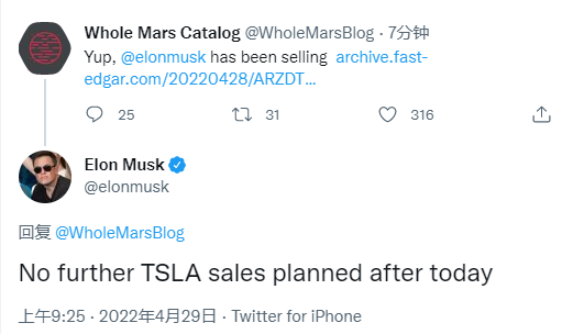 4 月 29 日消息,据美国证交会文件显示,美国证监会文件显示,特斯拉 CEO 埃隆・马斯克卖出 315 万股特斯拉股票,价值约 28 亿美元。马斯克在推特表示,之后没有进一步出售特斯拉股票的计划。