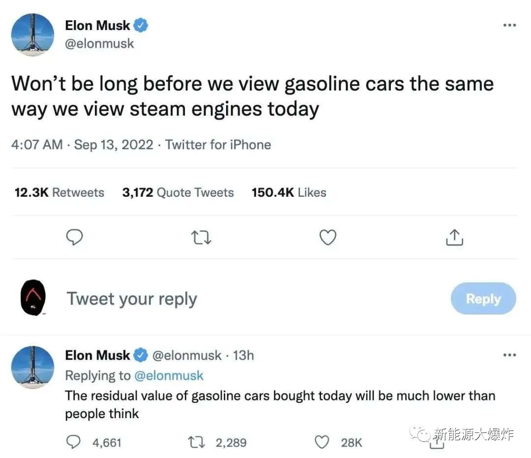 大概意思是,不久之后,我们看待燃油车,就会像我们今天看待蒸汽机一样,另外现在购买汽油车,后面它的残余价值将会比人们想象的低得多。