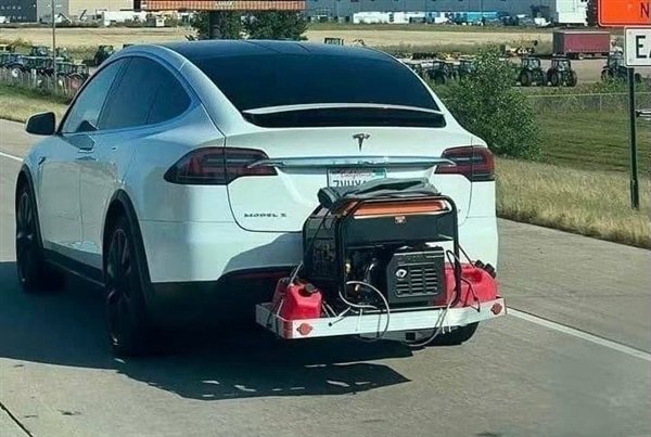 图里是一台特斯拉Model X,但不同的是,这台车的尾部还额外加装了一个支架,上满是一台柴油发电机,有电线连接到车内。