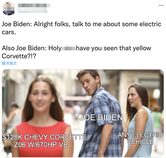 还有人模拟情景:“拜登:‘好的伙计们,跟我聊聊电动车。’还是拜登:‘我的天啊,你看到那辆黄色的科尔维特了吗?!?’”↓