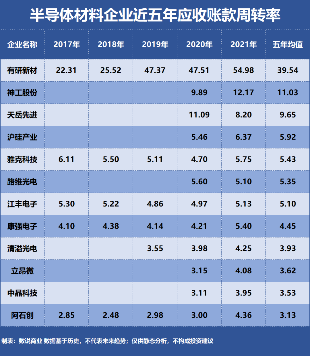 从近五年应收账款周转率来看,有研新材、神工股份等两家企业在10次以上,其中神工股份平均应收账款周转率11.03次。