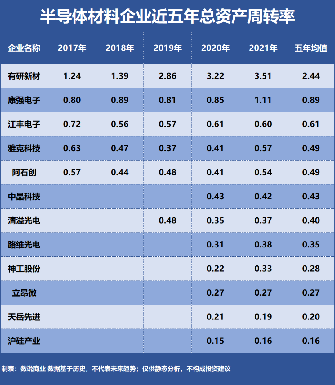 从近五年总资产周转率来看,有研新材、康强电子、江丰电子等3家企业在0.5次以上,其中有研新材平均总资产周转率2.44次。