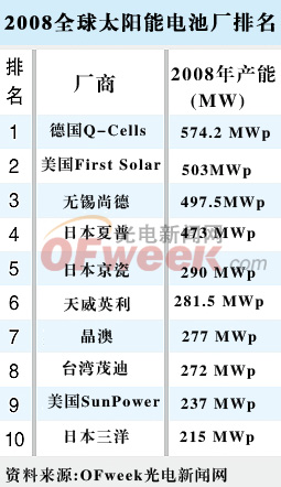 2008年全球10大太阳能电池厂排名分别为德国Q-Cells、美国First Solar、无锡尚德、日本夏普、日本京瓷、天威英利、晶澳、台湾茂迪、美国SunPower及日本三洋,其中,相比2008年各家厂商预测的产量数字中,诸多家厂商实际产量比预估值低。