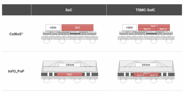 SoIC技术将同质和异质小芯片集成到单个类似SoC的芯片中,具有更小尺寸和更薄的外形,可以整体集成到先进的WLSI(又名CoWoS和InFO)中。从外观上看,新集成的芯片就像一个通用的SoC芯片,但嵌入了所需的异构集成功能。