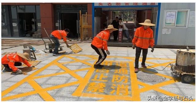 做好前奏的工作,划线的时候,把消防通道,禁止占用字样的模板放到测好的位置,然后把热熔涂料涂抹上去,就OK了,是不是和小时候照着模板画画一样呐。当然涂料的调配,反光玻璃珠施放还是要一定的经验知识和技巧。